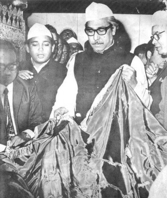 You can agree or disagree with his political philosophy, but even his enemies have no doubt about the patriotism of this man: Sheikh Mujibur Rahman, the founding father of Bangladesh. He spent most of his life fighting against the injustice bestowed upon Bangalees, first by the British, and then by the Pakistani Panjabi military/civil junta. After the mass uprising of 1969, he was given the title "Bangabandhu", means "Friend of Bengal". He is largely known as Bangabandhu among the millions of Bangalees.